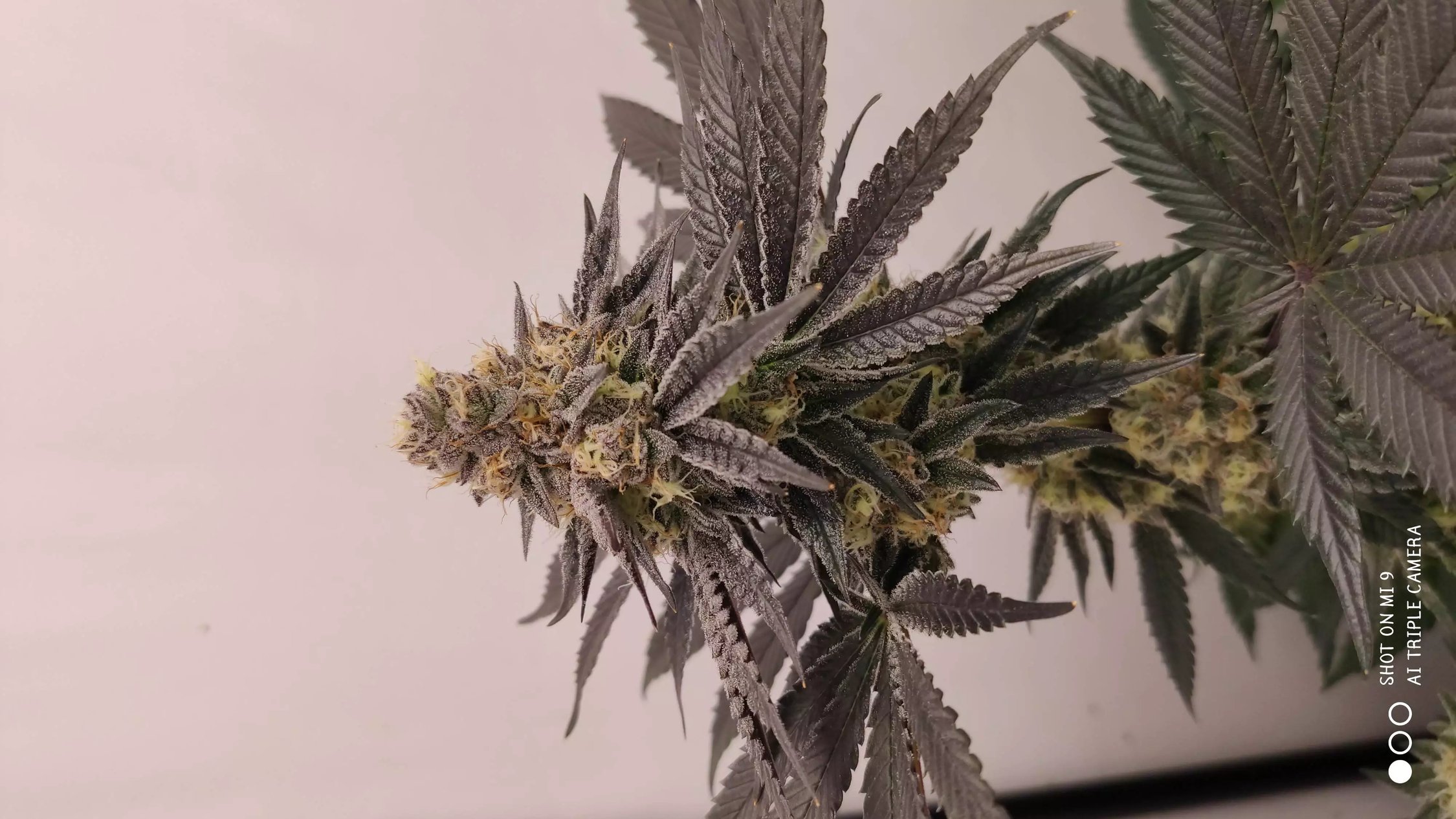 The color show, first noted in the veg stage, continued with dark shade leaves flushing green to purple-blue to violet. Adding to this color spectrum was an early build up of resin manifesting in a generous glistening of silvery white trichomes.